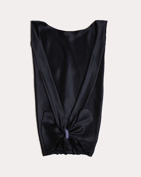 Wear the Fold over your head and hair keeping the elastic at the back of your neck. Pull out the Fold up encasing all your hair twist away the excess fabric. Seal the Fold and thread the ties through the Paradisefold tag loop to control tightness. Tie in a bow or as desired.