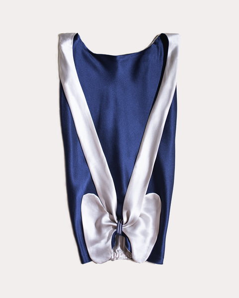 Wear the Fold over your head and hair keeping the elastic at the back of your neck. Pull out the Fold up encasing all your hair twist away the excess fabric. Seal the Fold and thread the ties through the Paradisefold tag loop to control tightness. Tie in a bow or as desired.