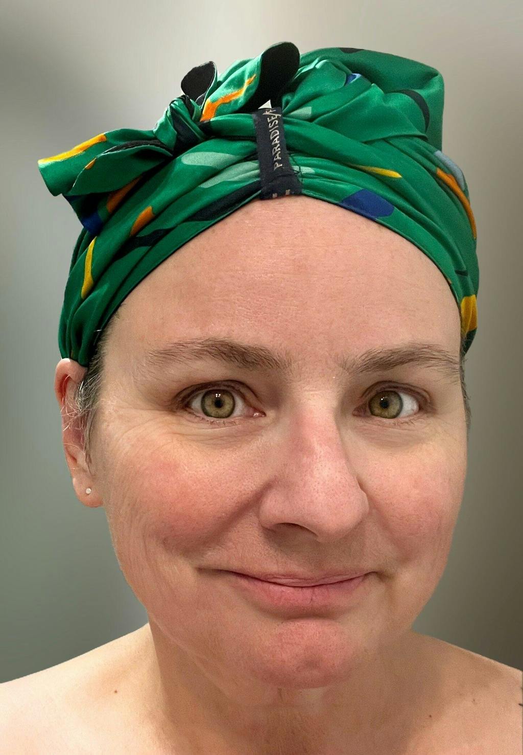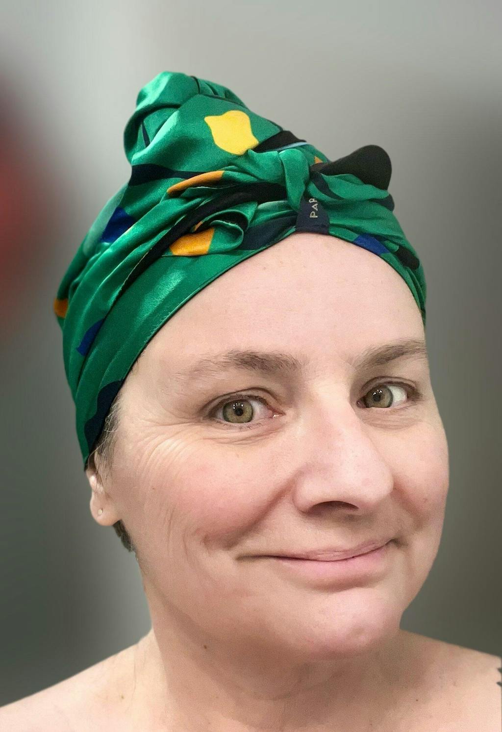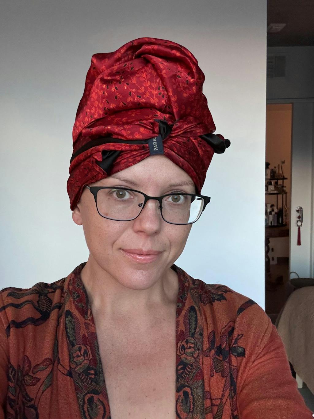 I am loving my paradise fold! The color is so bright and rich, I just love it. It so soft and silky, it feels great on and doesn’t not get hot. It really protects my curly hair and when I wake in the morning my curls are in tact- soft and springing.