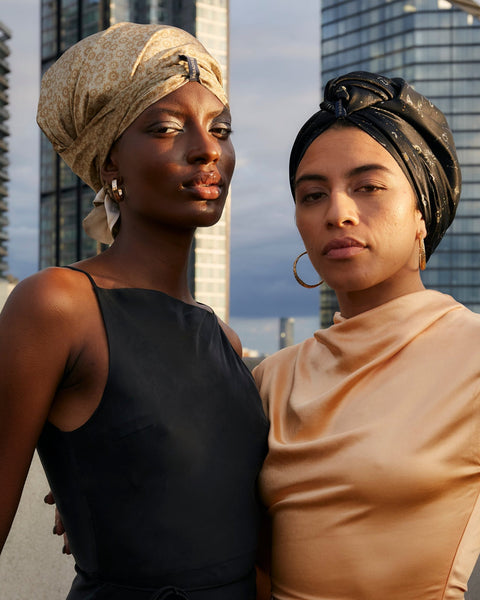 Fully reversible - Champagne silk interior. Style as a wrap or bandanna. Complementary shipping, lifetime care and gift box.
